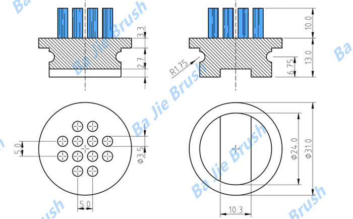 A Escova para botão da torre, também conhecido como um Escova de cama de botão ou Componente da mesa de escova de botão, é uma escova circular para grampos, feita para máquinas de prensa puncionadeira de torre. Cada escova é feita com um base plástica redonda e cerdas macias de nylon que apoiam suavemente o material em folha durante a perfuração, evitando arranhões, amassados ou danos à superfície. Por ter um formato que lembra um botão, é comumente chamada de "escova de botão". Durante a produção, vários furos são feitos na base de plástico e preenchidos com tufos densos de náilon, criando uma superfície de apoio durável e resistente.